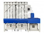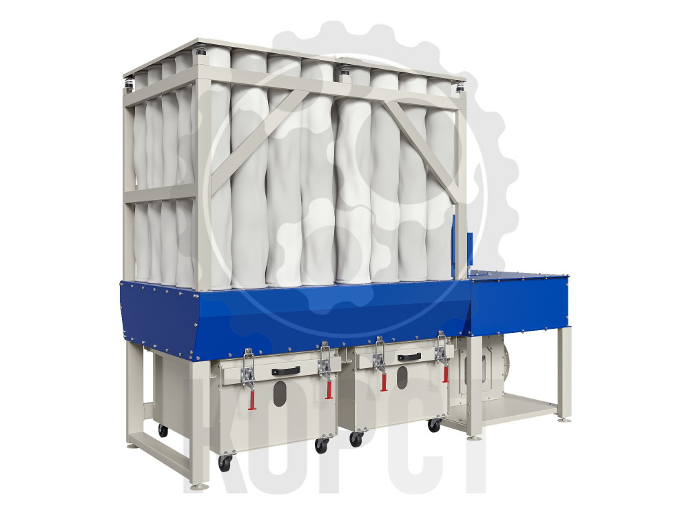 Фильтрационная часть включает 40 рукавов, обеспечивающих эффективную очистку воздуха от мелкодисперсной пыли. Для их обслуживания установлен вибромотор на крыше, который автоматически стряхивает накопившиеся отходы в контейнеры, поддерживая стабильную производительность системы.