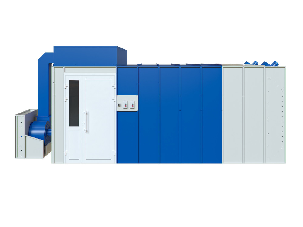 За первичную очистку, как и в чистой комнате с водяной завесой, отвечает фильтр грубой очистки воздуха, поступающего в потолочный приточный пленум. Он пропускает воздушный поток, удерживая крупные фракции посторонних примесей. Вторичную очистку выполняет сам приточный пленум, а финальная очистка ложится на зону сухой фильтрации, которая обеспечивает вытяжку излишков окрасочного тумана, возникающих во время распыления лакокрасочных веществ. В крышу вмонтирован вентилятор, который формирует разреженную атмосферу и заставляет частицы пыли и химических веществ поступать на фильтры.