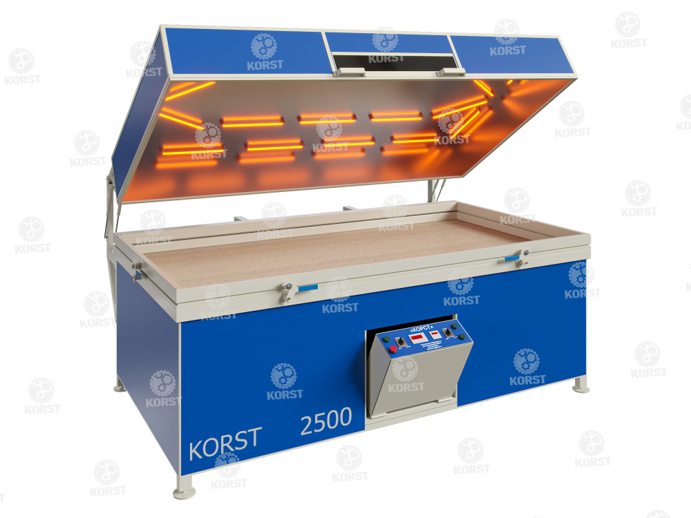Вакуумный пресс КОРСТ 2500 в модификации с откидным термомодулем отличается от других прессов, производимых нами, тем, что для открытия термомодуля в данной модификации используются газовые упоры.
