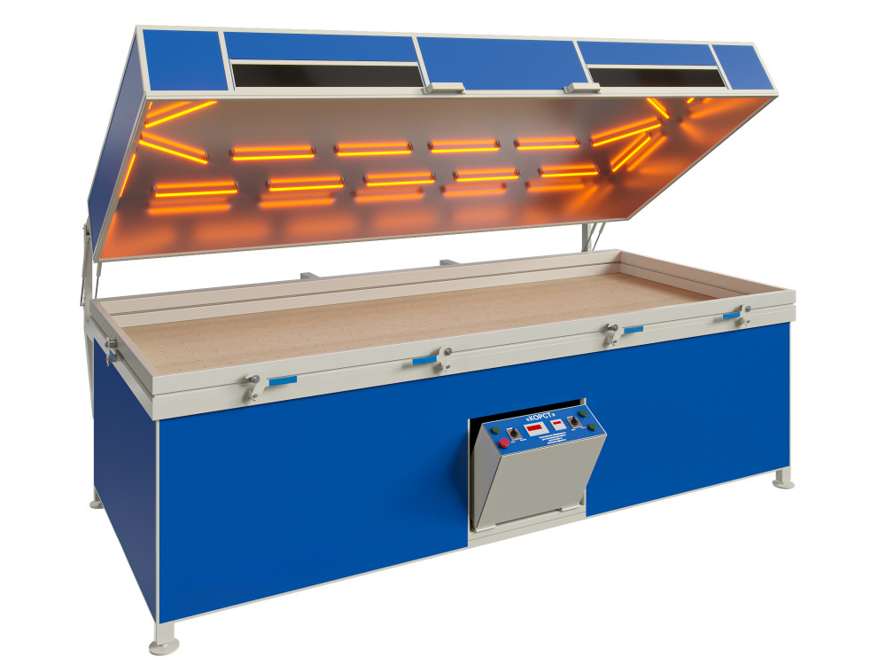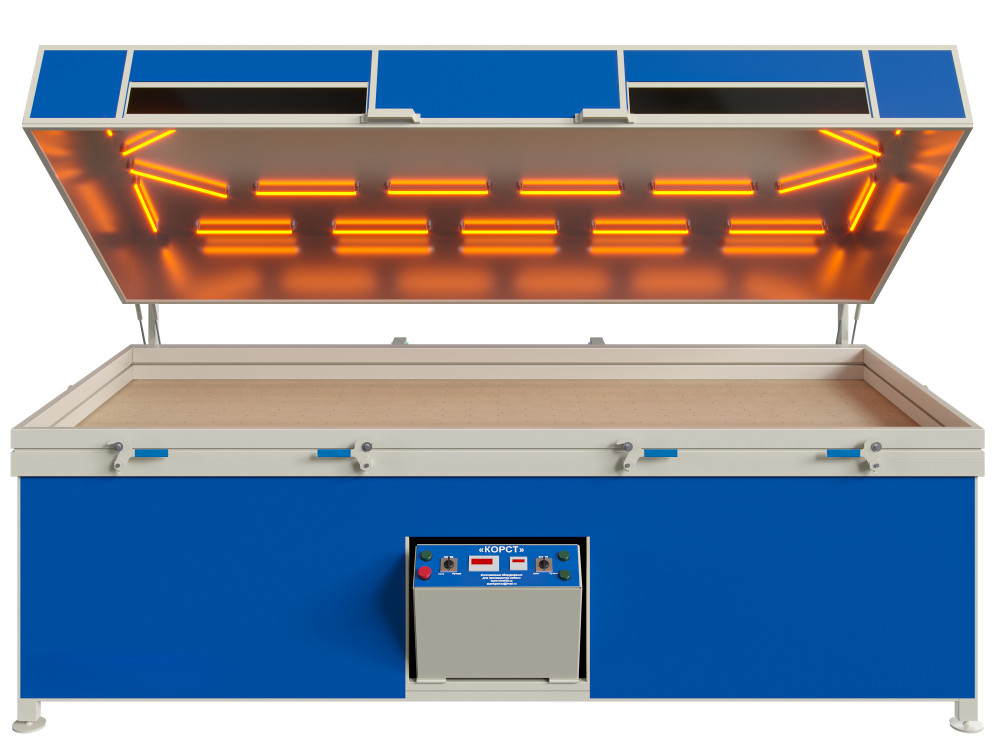 Вакуумный пресс КОРСТ 3000 в модификации с откидным термомодулем отличается от других прессов, производимых нами, тем, что для открытия термомодуля в данной модификации используются газовые упоры.